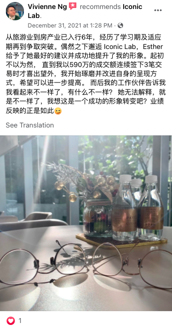 Hi,我是 Esther Liew,Iconic Lab 的創辦人。我和我的團隊幫助來自世界各地,各個領域的人士 wear to impress,讓他們在個人形象上得到提升。幫助他們在事業上吸引更多的機會,用自身的專業知識和一個富有魅力的形象,在市場上能夠比同行競爭者更有優勢。